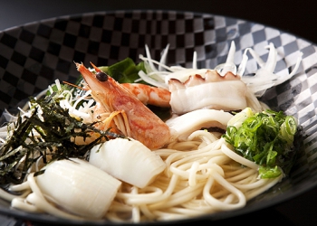 地元由良漁港の足赤海老やアオリイカ、地蛸やワカメなど海の幸をのせ、秘伝の出汁を引いたおろし生姜風味の特選つゆを餡かけ風にアレンジした海鮮淡路島ぬーどる。