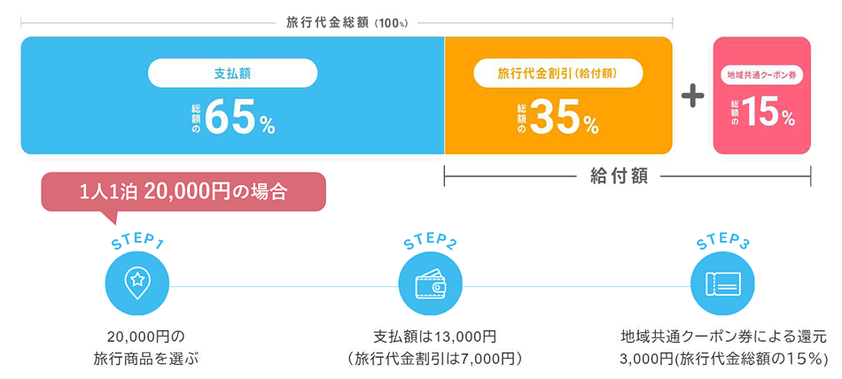 旅行代金の50%相当を補助(35%の旅行代金割引+15%の地域共通クーポン)